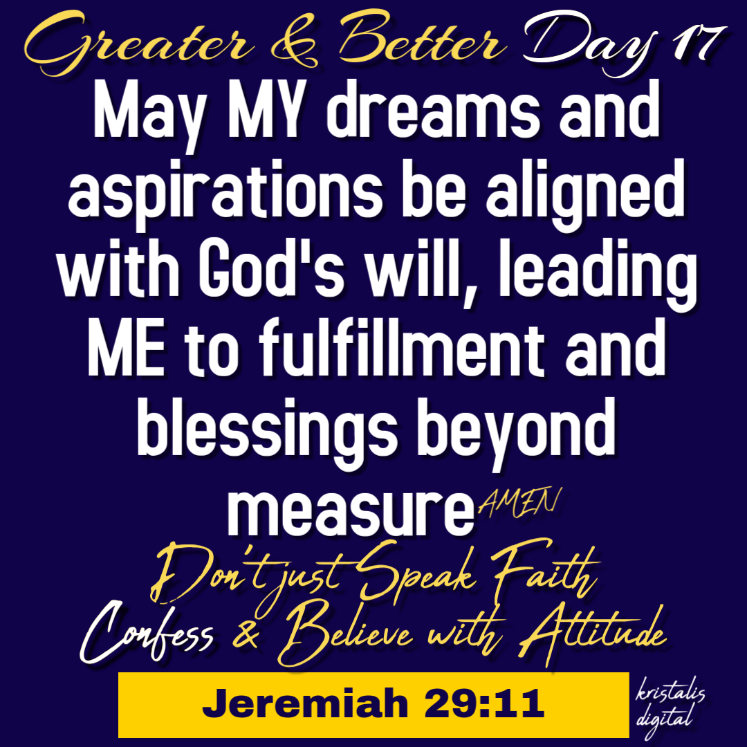“Lord, thank You for the dreams You’ve placed in my heart. I surrender them to You and ask that You align them with Your will. Help me to trust in Your plans and to walk faithfully in obedience to Your guidance. Lead me to fulfilment and blessings that bring glory to Your name. May my dreams be a reflection of Your purpose for my life, and may I always seek to honour You in all that I do. Amen.”
